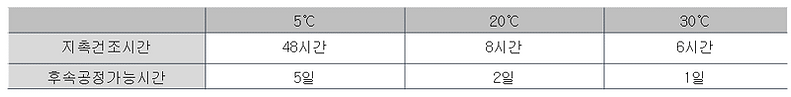 5. 안정적인 건조를 위하여 정상적인 기후 조건에서 건조되어야 하며, 완전건조가 될 때까지 외부충